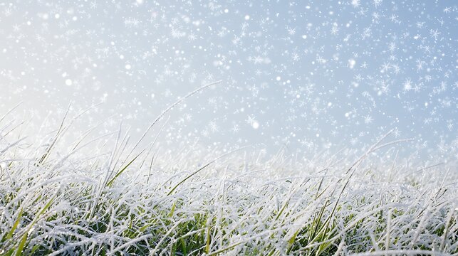 Frosted meadow with glinting snowy grass and falling snowflakes, serene winter bokeh
