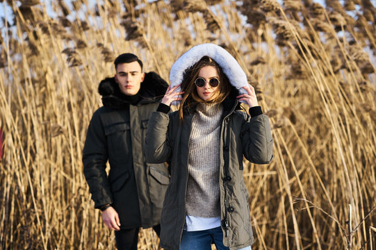 Winter woman wearing hat and scarf in autumn outdoors, enjoying peaceful nature beauty and calm portrait, with girl in serene and cozy coat amidst cold field reeds