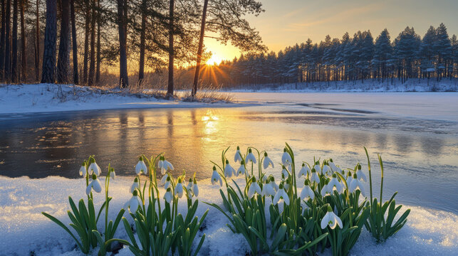 An elegant February morning scene of a frozen lake, its icy surface reflecting towering pine trees coated in shimmering frost. In the foreground, a cluster of snowdrops bloom resiliently through the s