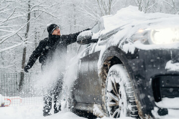 Man in black winter coat is clearing snow from a car parked in a snowy landscape with trees covered in white during a cold winter day in a remote area