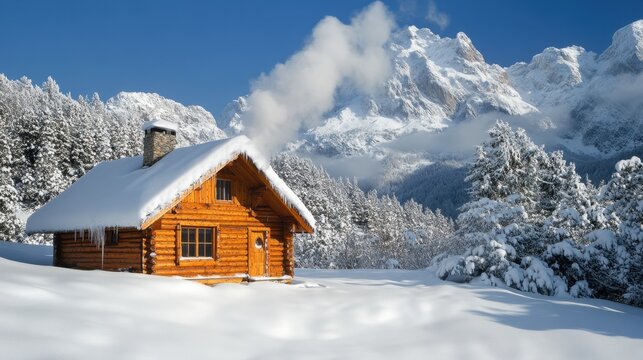 Snow covered cabin in a winter landscape surrounded by trees and snowy ground