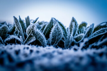 Close up macro shot of frost covered grass blades in a winter landscape with a soft blue and white bokeh background creating a serene and cold atmosphere