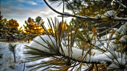 Close up of snow covered pine needles with a forest and sunset in the background on a winter day