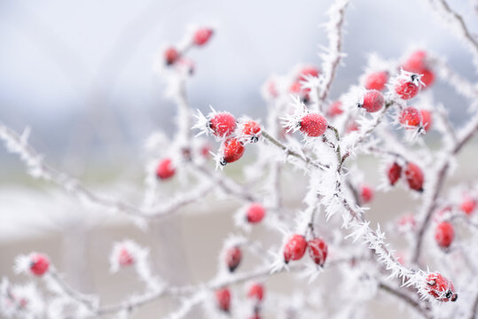 In winter when there is frost and sub-zero temperatures, a bush with rose hips is covered with ice and ice crystals