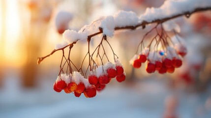 Red rowanberry still life covered with white snow on a tree branch at sunset. Winter concept.
