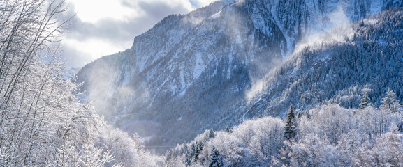 View of snow covered trees, mountains from Dolonne in winter, Courmayeur, Aosta Valley, Italian Alps