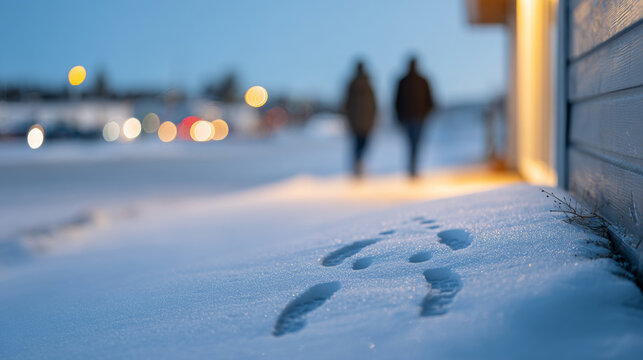 Footprints in fresh snow near a building with two blurred figures walking in the background during twilight with soft bokeh lights