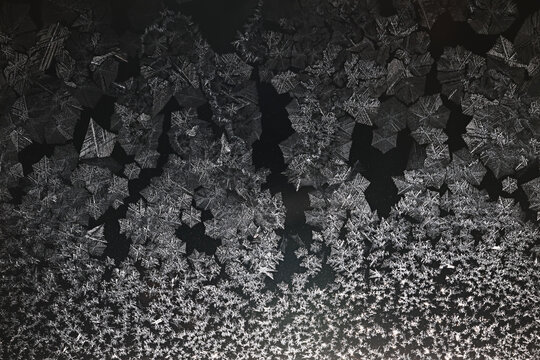 Delicate winter frost patterns on glass creating an icy abstract texture for seasonal backgrounds.