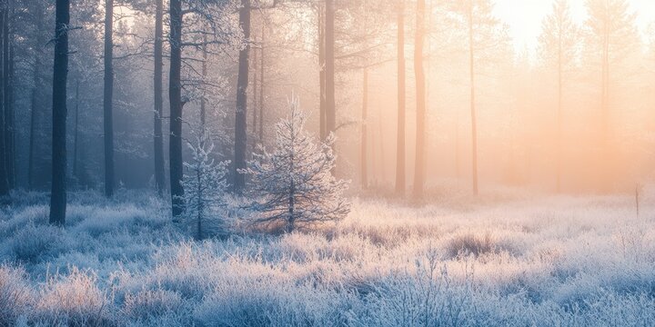 A serene winter forest scene, bathed in soft morning light, showcasing frosty trees and tranquil frosted grass.