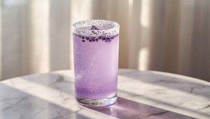 Elegant topdown shot of frosted lavender oil bottle surrounded by dried lavender buds on a white surface with soft lighting and ample copy space for branding or text