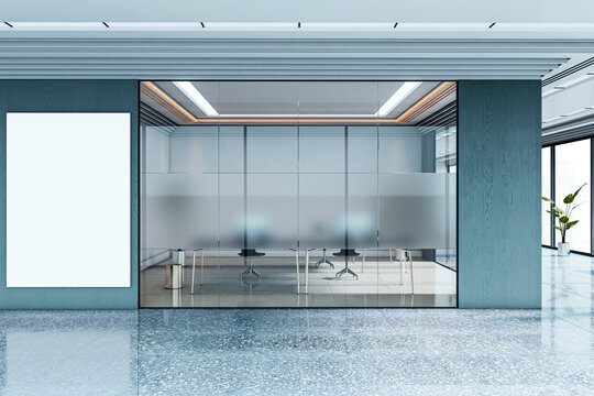 Modern glass-walled office room with frosted panels and large vertical poster mockup on clean interior wall in corporate building hallway. 3D Rendering
