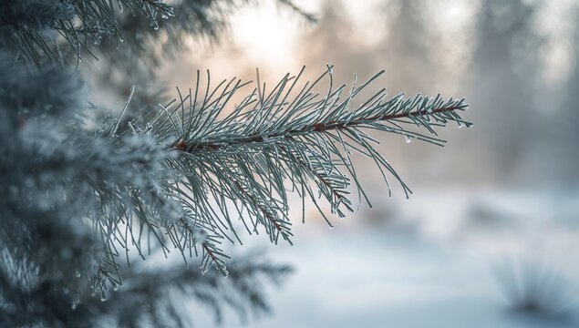 Frosted evergreen branch close-up with soft snow bokeh and winter light