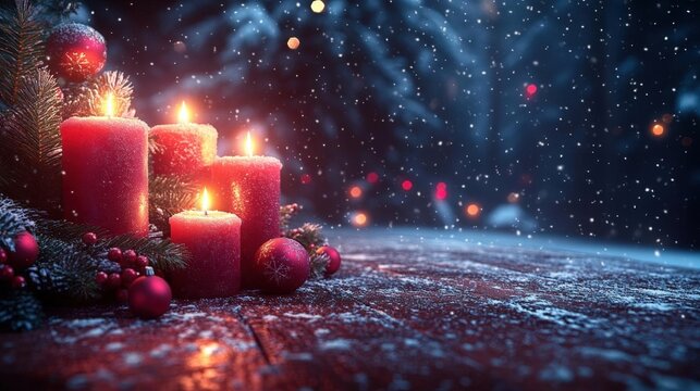 Warm Christmas Candles On Snowy Wooden Table
