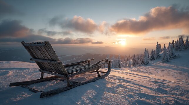 Frozen expanse of a winter lake, nestled amidst a dense forest. Sunlight illuminates the snow-covered valley, highlighting the tranquil winter scene