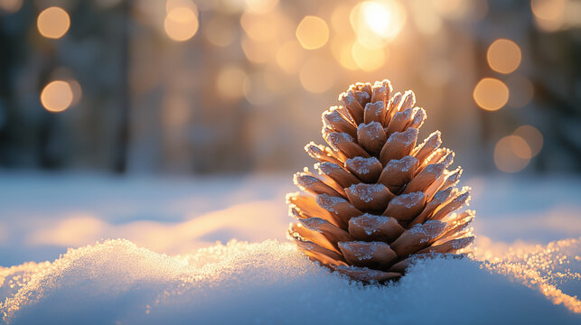 A close-up of a frosted pine cone resting gently on fresh snow, illuminated by the soft glow of golden sunlight. The bokeh effect, magic to the wintry scene, the beauty of nature in winter.