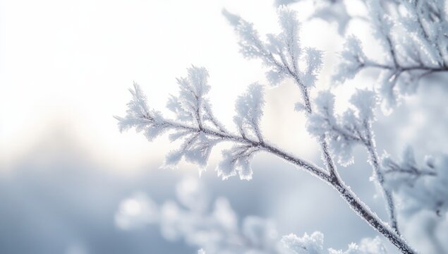 Frosted branch glistening with delicate ice crystals and soft snowy bokeh background