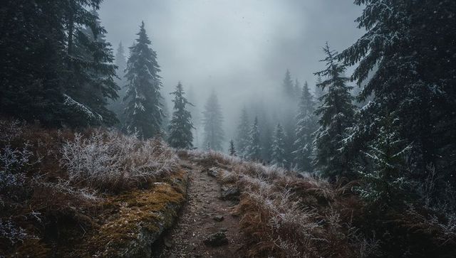 Mountain trail winding through frost-covered alpine forest under moody overcast sky