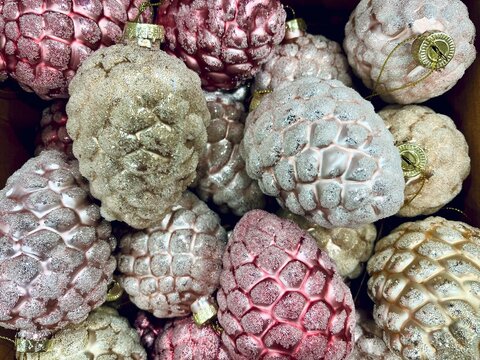 Full frame close-up of a stack of pastel coloured glitter frosted glass pinecone ornaments