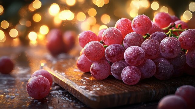 Frosted red grapes on wooden board, bokeh lights