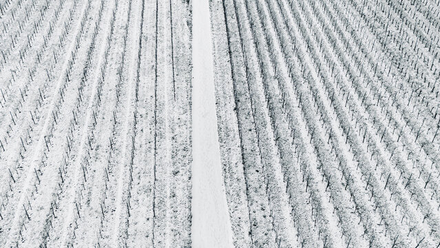 Moselle river valley, winter season, snow and frost covered vineyard landscape near Trier, Germany, aerial view