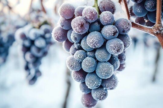 frost-covered purple grape cluster hanging on vine with snow and blurred vineyard background, evoking cold quiet serenity