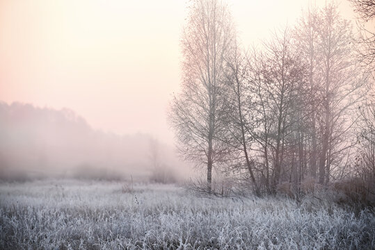 Misty foggy morning in frosty meadow with trees