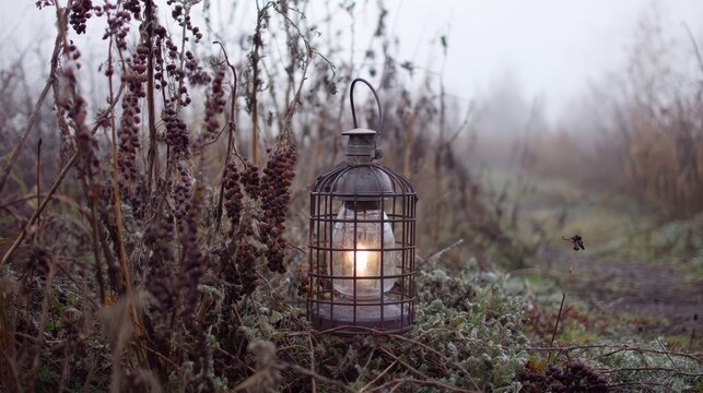 A vintage lantern glows warmly amidst frosted foliage on a misty autumn day.