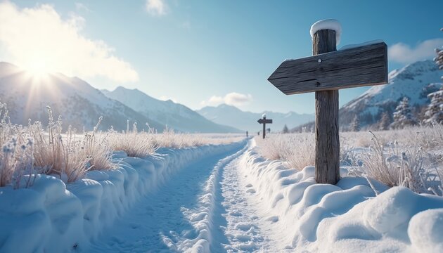 A snowy path leads through a frosted field toward distant mountains under a bright sun. A wooden signpost indicates a direction on the clear winter day. Peaceful journey ahead.