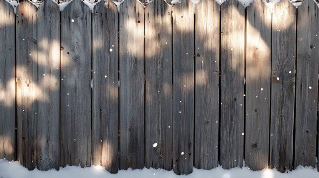 Rustic winter: A weathered wooden fence dusted with snow and dappled sunlight