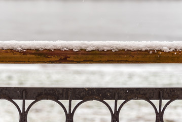 Sunset through frosted glass with snowflake bokeh and warm twilight horizon glow