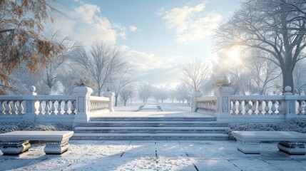 Sunbeams casting warm light through frosted boreal pines at dawn, misty frosted meadow