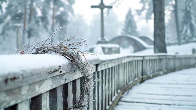 Christmas lights and colorful baubles decorating a snow covered winter city bridge railing at twilight, with a cityscape and falling in the background