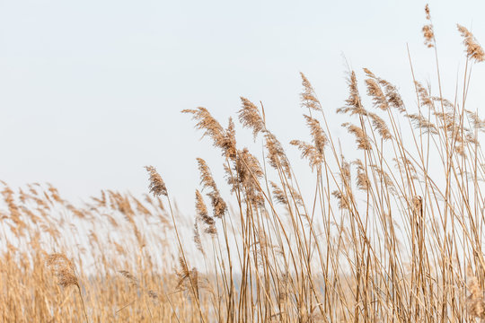 Close-up abstract view of Cortaderia selloana, pampas grass plumes in soft beige, brown winter tones. Dry reeds with fluffy stems create natural, boho-style bokeh background. Serene, calm, frosty