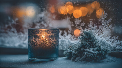 Frosted window panes capturing serene winter's glow