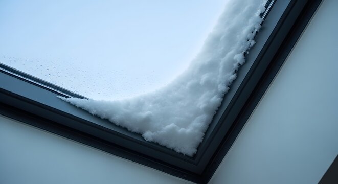 Interior view of a slanted skylight window blocked by snow, diffusing light into a dark room and creating a cold winter mood.