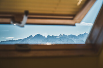 roof window view of sunset in the mountains. view from the attic window of the wooden cottage in mountain valley. Panorama of snowy mountains.