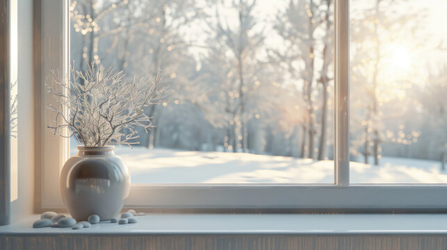 White windowsill with view of snowy landscape, Vase on windowsill background