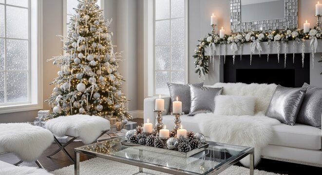 Glowing candlelight casting warm glow in cozy christmas nook with frosted evergreen trees