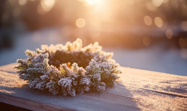 Frosted evergreen wreath glowing softly under soft golden sunlight resting on a rustic wooden surface, a serene seasonal design