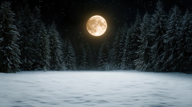 Snow moon snowy pine forest night sky serene glowing full moon above frosty clearing