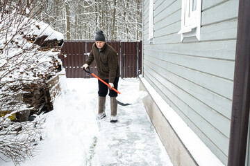 Blue snow shovel with black handle isolated on transparent background for winter cleaning