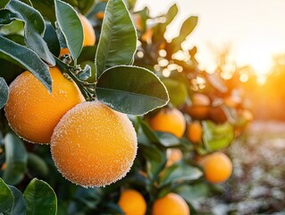 Frosty Orange Orchard, A Morning Sunrise Touches Winter's Iced Citrus