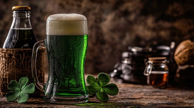 A green mug of beer with a frothy head and clovers on a wooden table.