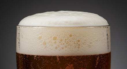 Close-up of a beer glass topped with a thick, creamy head of foam.
