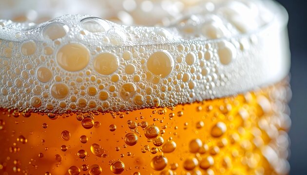 Close-up of frothy green beer in a mug, bubbles shimmering, clover-shaped foam decorations, festive tabletop