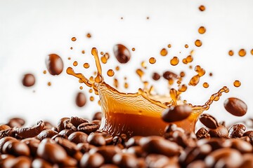 Coffee beans splashing into coffee in mid-air, droplets frozen in time, set against a bright white background with ultra HD quality.