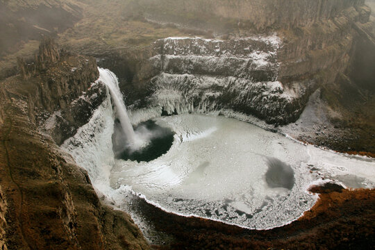 Majestic Frozen Waterfall Cascading Through A Snowy Gorge In Winter