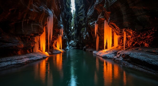 Fiery Icicles Illuminate a Dark Winter Canyon River