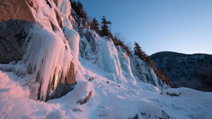 Frozen waterfall sunrise cascading mist over snowy gorge with icicle-coated rock panorama