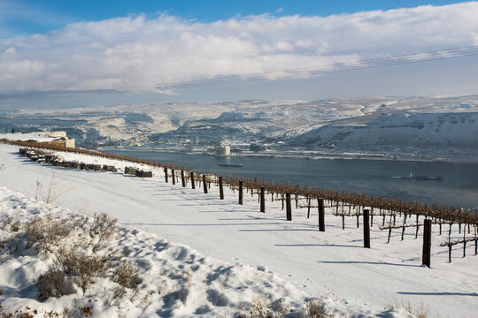 Snow-covered banks of the Columbia River. Vineyard in the foreground.  The border between the states of Washington and Oregon. View from the Washington coast